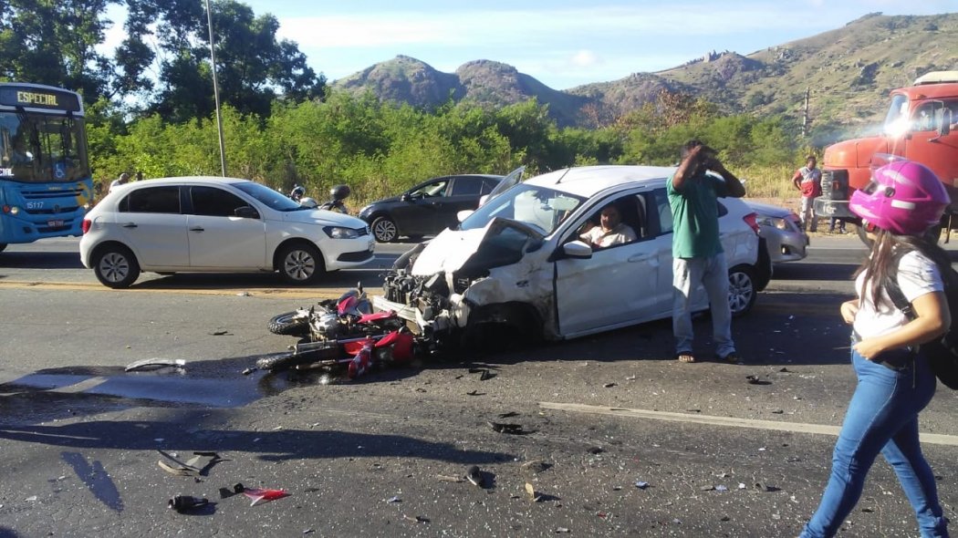 Um acidente envolvendo três carros e uma moto deixou quatro pessoas feridas no Km 260 da BR 101, em Campinho da Serra, no sentido Linhares,