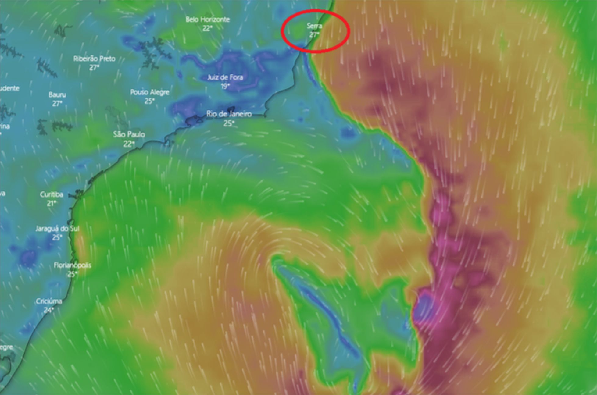 Mapas indicavam a formação do ciclone próximo à costa capixaba, mas o fenômeno foi registrado a 700 quilômetros de Arraial do Cabo, no Rio de Janeiro . (Imagem: reprodução/Windy.com)