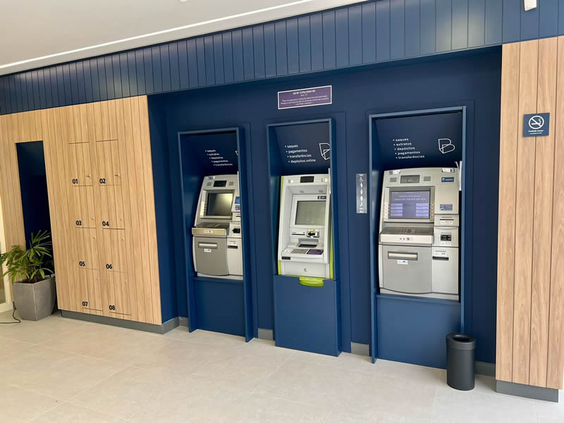 Os móveis instalados também seguem o novo padrão adotado pelo banco, com acabamento amadeirado e feito em marcenaria. O piso vinílico garante um ambiente mais acolhedor; as salas dos gerentes são todas fechadas em vidros, trazendo mais privacidade; paredes em drywall e o teto com forro em gesso acartonado.