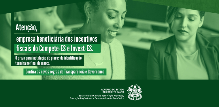 Empresas beneficiadas por incentivos tributários, por meio do Programa de Incentivo ao Investimento no Estado do Espírito Santo (Invest-ES) e do Programa de Desenvolvimento e Proteção à Economia do Estado do Espírito Santo (Compete-ES), têm até 31 de março de 2022 para realizar a instalação das placas indicativas, um requisito obrigatório de acordo com a legislação estadual. No Espírito Santo, 2.500 empresas estão ativas no Compete-ES e 309 estão ativas no Invest-ES. O novo prazo foi regulamentado na Portaria nº 005-R, de 07 de janeiro de 2022, publicada no Diário Oficial do Estado.
