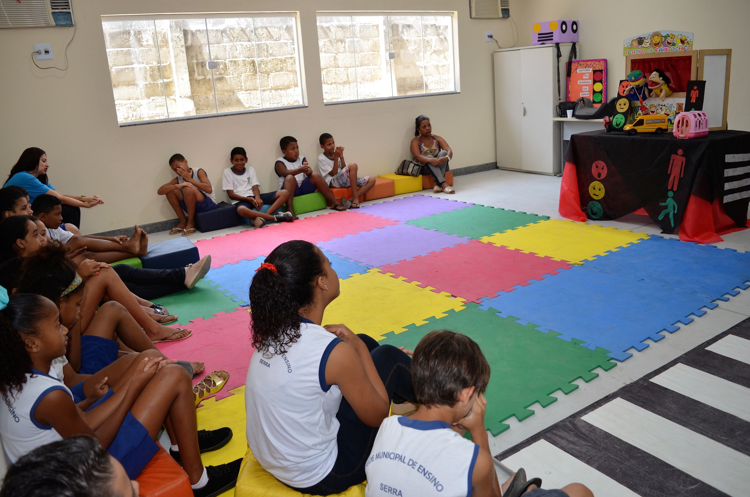 Entre as dinâmicas pedagógicas, destacam-se a contação de histórias, teatro de fantoches e “Transitolândia”, um grande jogo de tabuleiro com perguntas sobre comportamentos seguros no trânsito.(Imagem: Divulgação/Assessoria de Comunicação do Detran|ES)