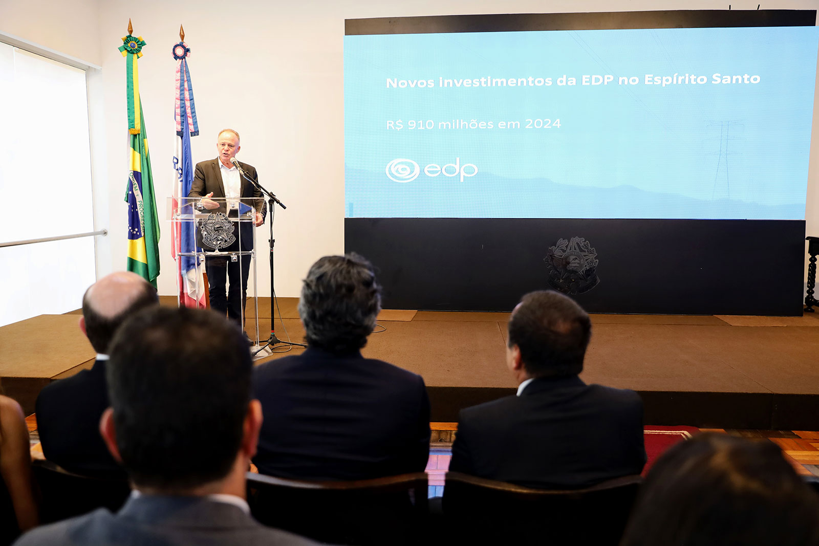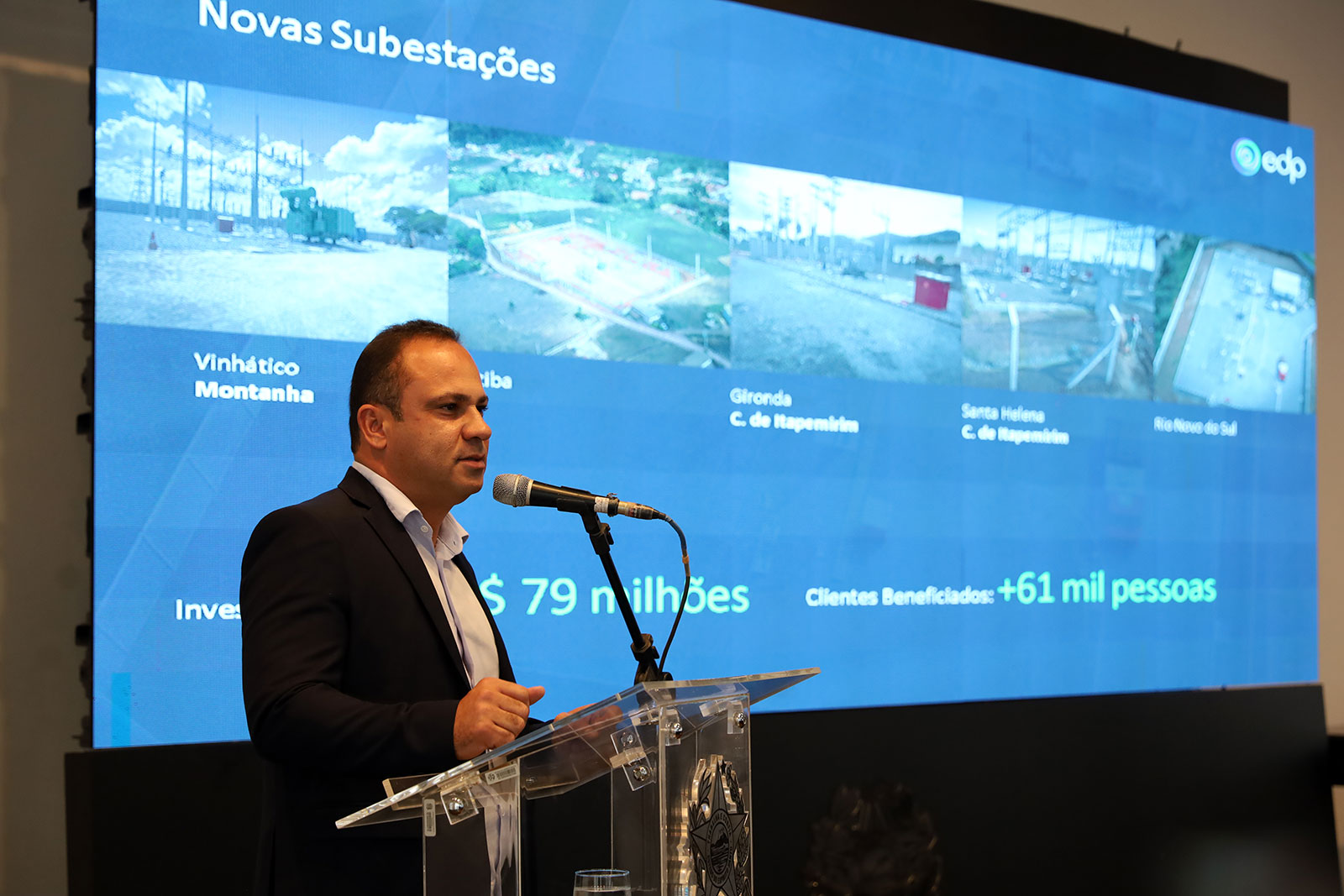 A solenidade realizada no Palácio Anchieta, em Vitória, teve a presença do CEO da EDP Brasil, João Marques da Cruz, além de prefeitos e outras autoridades. Foram inauguradas as subestações Santa Helena, Gironda, Rio Novo do Sul, Ibatiba e Vinhático, com investimento de R$ 79 milhões e que vão beneficiar mais de 61 mil clientes nos municípios de Nova Venécia, Vila Pavão, Cachoeiro de Itapemirim, Rio Novo do Sul, Vargem Alta, Itapemirim, Ibatiba, Muniz Freire, Montanha e Pedro Canário.