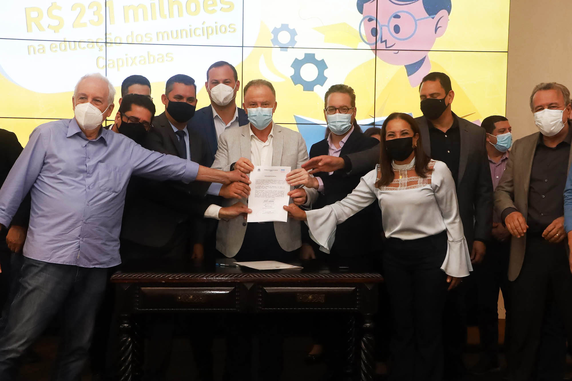 O presidente da Associação dos Municípios do Espírito Santo (Amunes) e prefeito de Cachoeiro de Itapemirim, Victor Coelho, fez um agradecimento pelos investimentos nos municípios. “Em nome dos prefeitos capixabas, gostaria de agradecer e dizer que estamos muito felizes. Não existe data melhor para fazer uma entrega de R$ 231 milhões para a educação do que na véspera do Dia dos Professores. A gestão do senhor governador é exemplo para nós prefeitos e para o Brasil”, declarou.