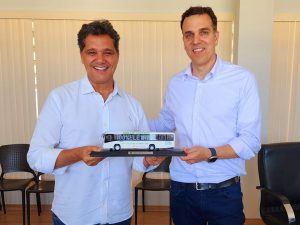 Ao comemorar 10 anos de atividades no Espírito Santo, a fábrica da Marcopolo em São Mateus, entregou o primeiro ônibus elétrico produzido na unidade. Nesta quinta-feira (17), para apresentar a novidade, a diretoria da empresa recebeu o vice-governador e secretário de Desenvolvimento do Estado, Ricardo Ferraço; o secretário de Estado da Fazenda, Benício Costa; e diretores do Banco de Desenvolvimento do Espírito Santo (Bandes).