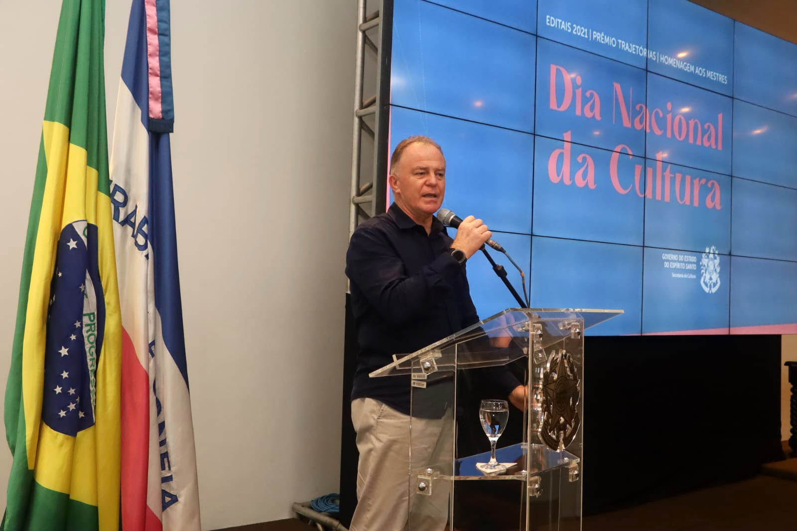 O governador do Estado, Renato Casagrande, lançou, nesta quarta-feira (10), em solenidade no Palácio Anchieta, em Vitória, os Editais da Cultura 2021. Durante a solenidade alusiva ao Dia Nacional da Cultura, houve a entrega do prêmio dos contemplados do Edital 013/2020 – Mestres e Grupos Populares “Prêmio Mestre Armojo do Folclore Capixaba”; a entrega do prêmio Trajetórias – em reconhecimento a diversos grupos artísticos e de cultura popular –; e as apresentações do Coletivo de Slam Nísia e a Cia de Dança Negraô, de Vila Velha.