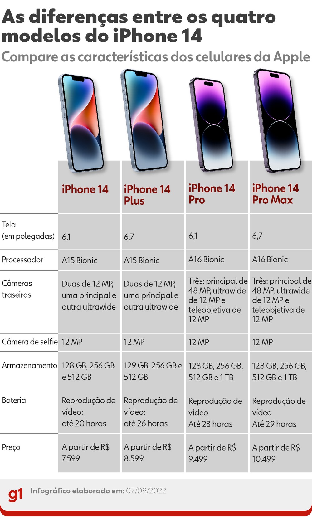 O g1 testou a versão do iPhone 14 com o maior espaço de armazenamento (512 GB). No Brasil, ela é vendida por R$ 10.599 no lançamento. Confira abaixo as impressões sobre o celular.