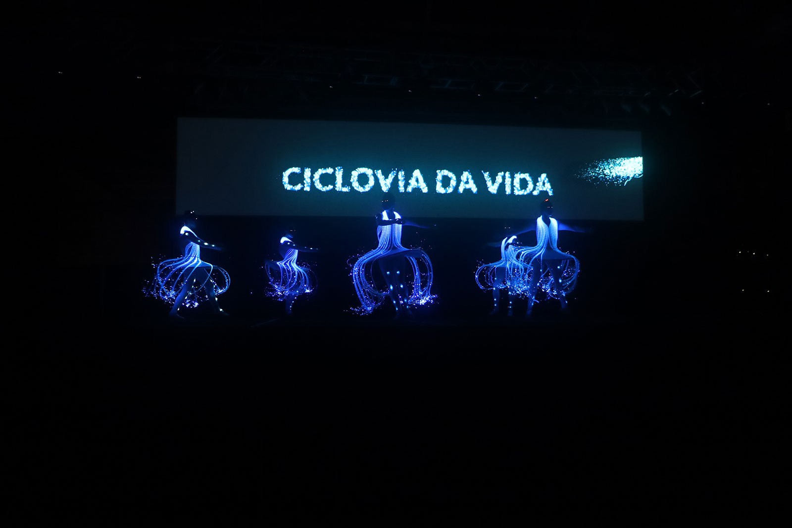 No palco, uma apresentação de um grupo de balé com LEDs, encantou em um espetáculo inovador de luzes e movimento. A programação também incluiu um show de águas dançantes iluminadas.