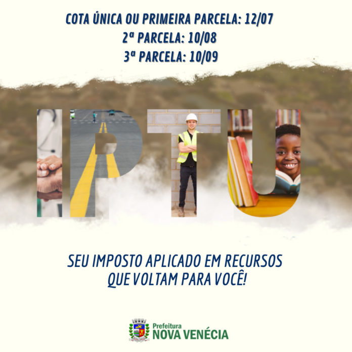 A Prefeitura de Nova Venécia por meio da Secretaria de Finanças informa ao contribuinte veneciano que o prazo para o pagamento da primeira parcela do Imposto Predial e Territorial Urbano (IPTU) de 2021 vence na próxima segunda-feira (12). Após o vencimento, os valores ficam sujeitos à multa de 0,4% ao dia até o limite de 12%, mais juros de 1% ao mês.