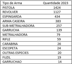 Os dados do programa de Segurança Pública mostra um aumento de 82 novas armas apreendidas em 2023 em relação à 2022. No primeiro semestre de 2023, 317 armas foram tiradas do tráfico. Já no segundo semestre do mesmo ano, no aumento de apreensão de armas, o número saltou para 343 armas apreendidas. O relatório revela ainda que 79% dos homicídios são praticados com o uso de arma de fogo.