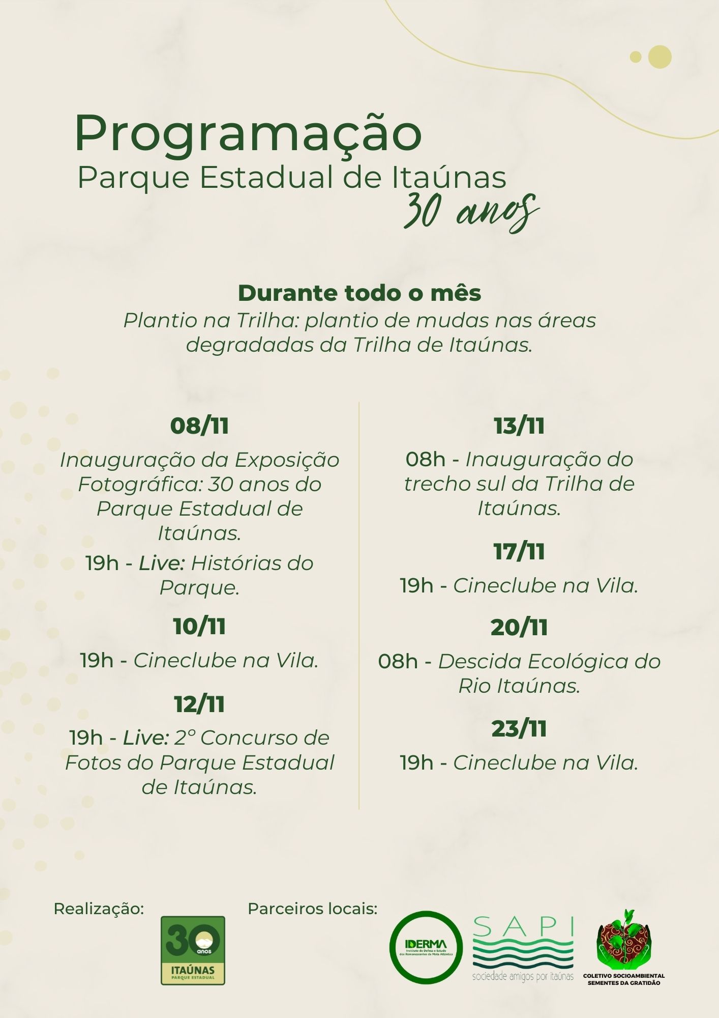 As ações, que serão híbridas e presenciais, começam nesta segunda, com a inauguração da Exposição Fotográfica: 30 anos do Parque Estadual de Itaúnas, na sede da Unidade de Conservação. As imagens ficarão expostas durante todo o mês. Ainda nesta segunda, será realizada a live “Histórias do Parque”, a partir das 19 horas, no canal do PEI no YouTube.