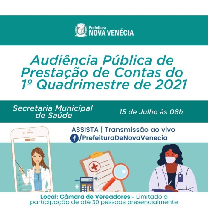 Nesta quinta-feira (15) a Secretaria Municipal de Saúde de Nova Venécia realiza Audiência Pública de Prestação de Contas do 1º Quadrimestre de 2021, às 8h, através de transmissão ao vivo pela internet, via facebook da Prefeitura: facebook.com/prefeituradenovavenecia