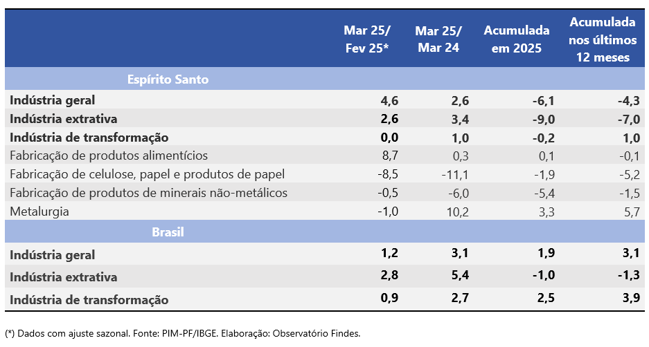A produção industrial do Espírito Santo avançou 2,6% em março de 2025 frente ao mesmo mês do ano anterior. O dado é da Pesquisa Industrial Mensal (PIM-PF), divulgado nesta quarta-feira (14) pelo do IBGE e foi compilado pelo Observatório Findes. O crescimento foi impulsionado principalmente pelo desempenho da indústria extrativa (+3,4%) e da indústria de transformação (+1%).