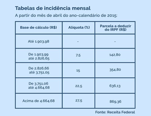 - A retenção segue a tabela de Imposto de Renda – Pessoa Física da Receita Federal, abaixo indicada: