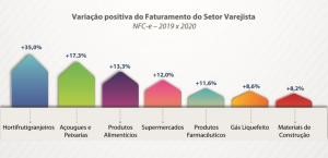A análise foi feita com base nos dados de março a junho da Receita Estadual, na comparação com o mesmo período do ano passado. No intervalo, o setor varejista hortifrutigranjeiro foi o que apresentou a maior alta de faturamento: 35%. Na sequência aparecem açougues e peixarias (17,3%), produtos alimentícios (13,3%) e supermercados (12%). Também tiveram crescimento no faturamento a venda de produtos farmacêuticos (11,6%), gás liquefeito (8,6%) e materiais de construção (8,2%).