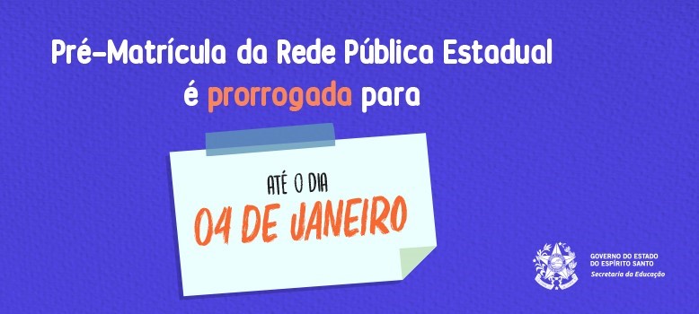 O prazo de solicitação da Pré-Matrícula termina nesta segunda-feira (04), e deve ser realizada no site da Sedu – www.sedu.es.gov.br, por meio do Sistema Estadual de Gestão Escolar (Seges) CLIQUE AQUI. Esta é a segunda etapa da Chamada Pública Escolar, ou seja, para aqueles alunos que desejam estudar em uma das escolas da Rede Estadual.