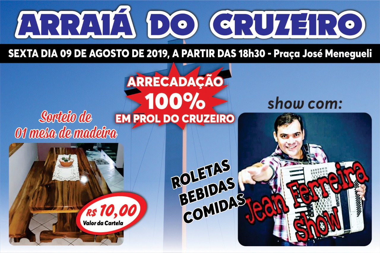 Acontece hoje (09) na Praça José Menegueli, à partir das 18h30, o Arraiá do Cruzeiro. Haverá show com Jean Ferreira, sorteio, roleta, comida típica e bebida. A festa, organizada pelo time DNA FC (Data de Nascimento Avançada Futebol Clube), tem objetivo de arrecadar fundos para a reconstrução do Cruzeiro.