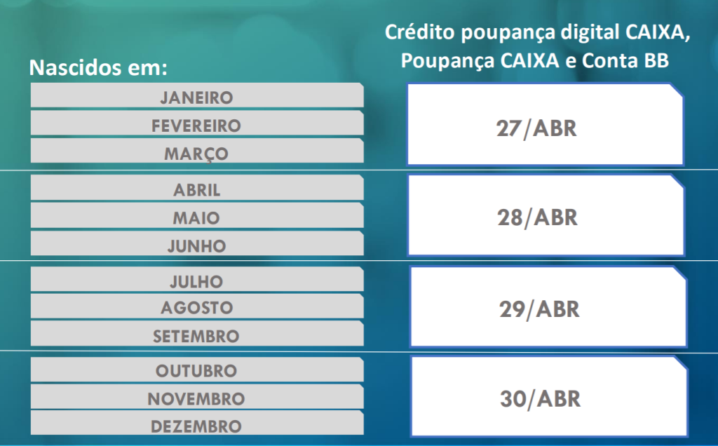 No dia 27 de abril recebem o valor os brasileiros que estão incluídos no CadÚnico e cadastrados no app e fazem aniversário em janeiro, fevereiro e março. No dia 28, serão pagos os créditos aos que fazem aniversário em abril, maio e junho; no dia 29 os que fazem aniversário em julho, agosto e setembro e, no dia 30 de abril, aqueles que completam mais um ano de vida nos meses de outubro, novembro e dezembro.